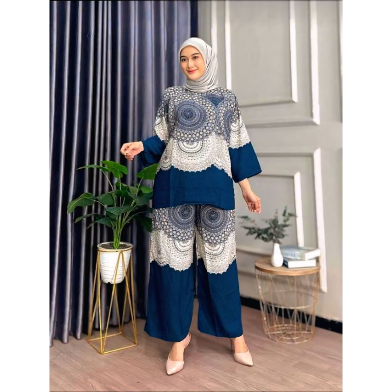 Tania Setelan Terbaru Kekinian JUMBO Setelan Celana Kulot Panjang Lengan 7/8 Rayon Motif Premium Baju Dewasa Wanita Adem