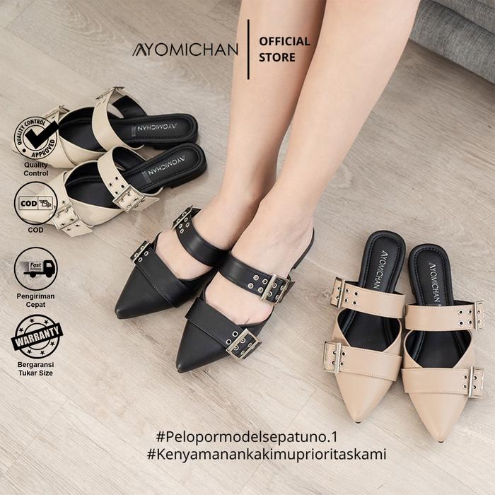 Sepatu Kulit Wanita Ayomichan - Zee Buckle Strap AYM502 Mules Sepatu Wanita / Sepatu Flat Black