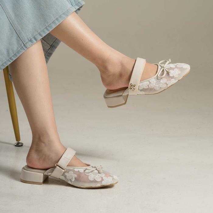 Sepatu Kulit Wanita Dianable - Lyria Lace Cream Baru Heels Mules Sepatu Wanita