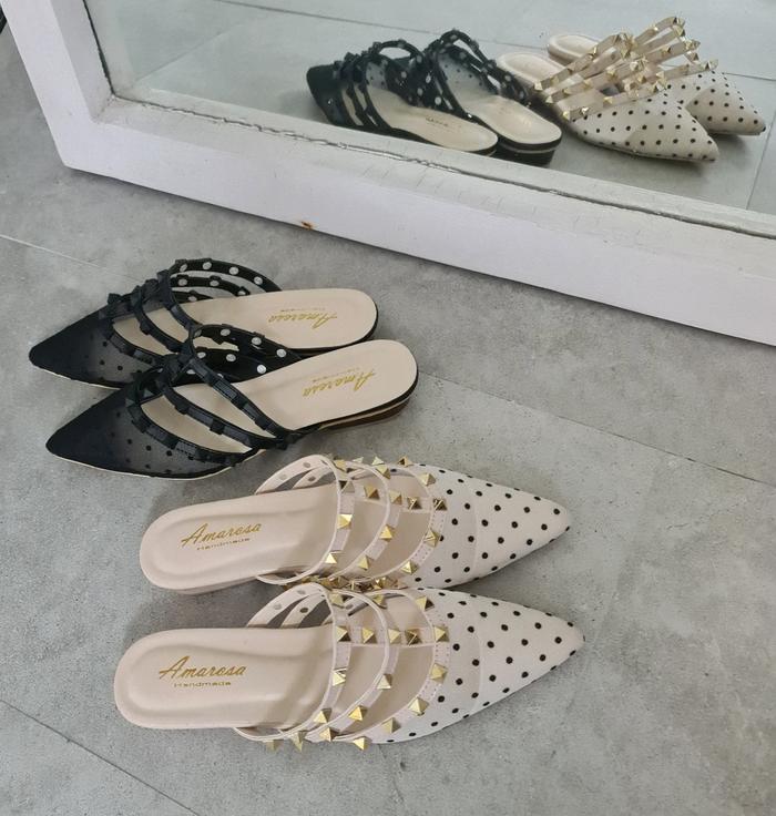 Sepatu Kulit Wanita Amarose VL.01 - V. Loafer Mesh Rockstud Dotted Piramid Mules Heels 2cm Black Dan