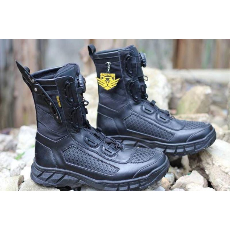 Sepatu Pdl Brother boots safety Tni Polri kulit asli ujung besi tali putar cepat anti air Merk Brotrher Fitwon