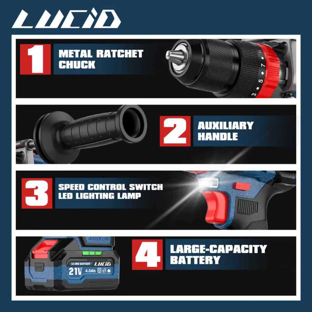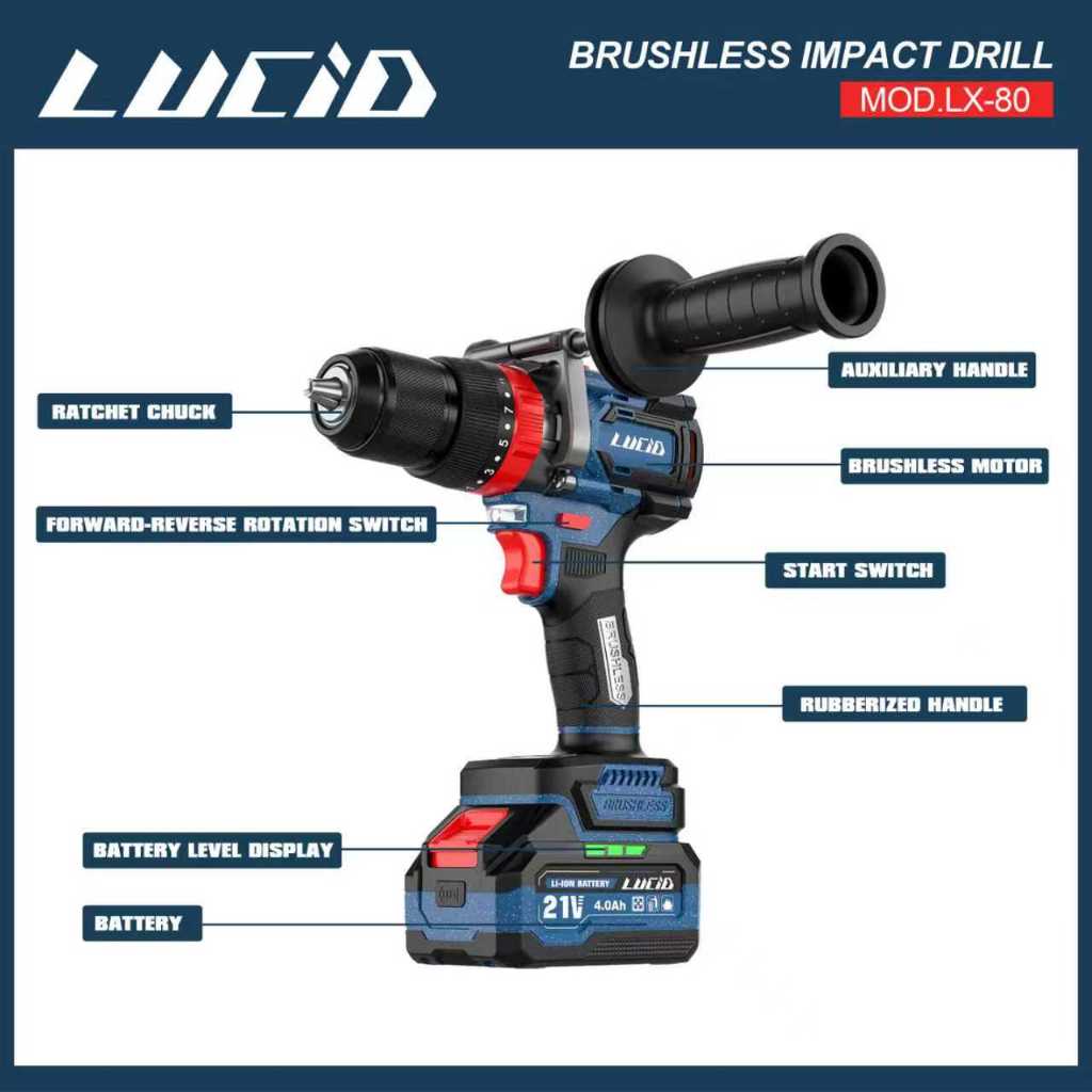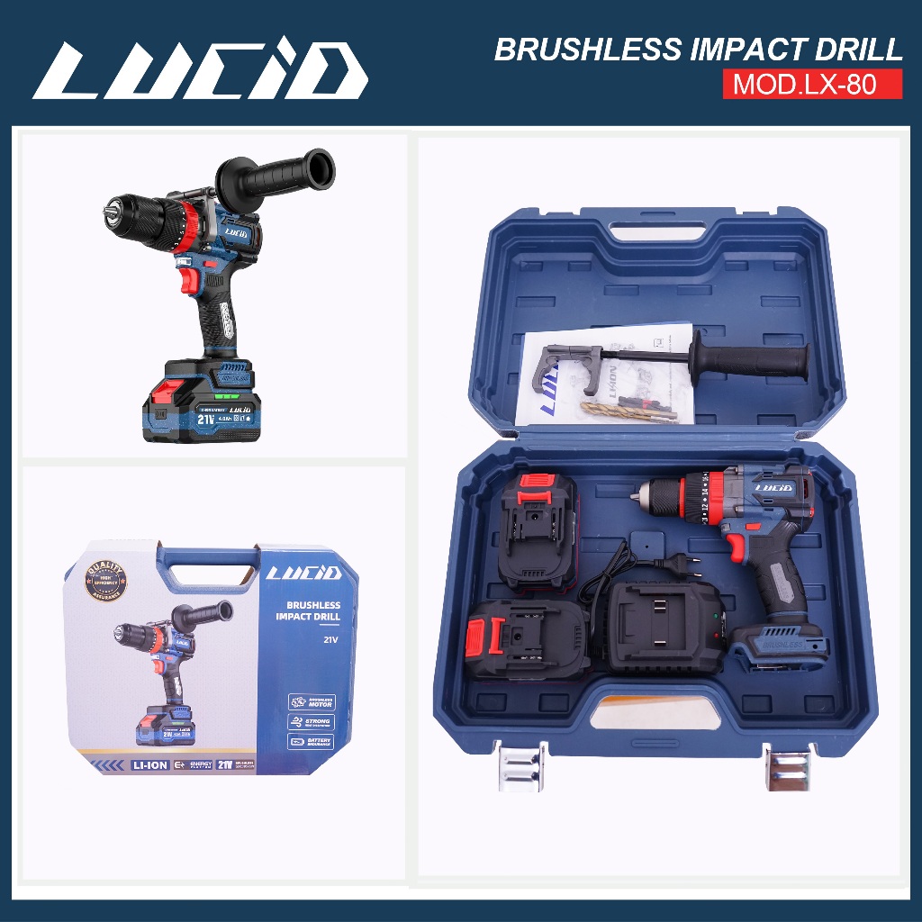 LUCID LX-80 Brushless Mesin Bor 13MM 4.0A 21V EVE 20P A-Class Lithium Battery 160NM Bor Listrik Impact Cordless Drill A