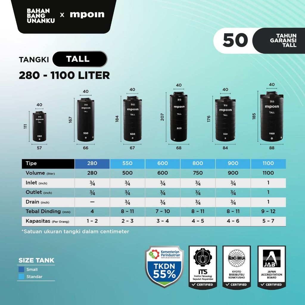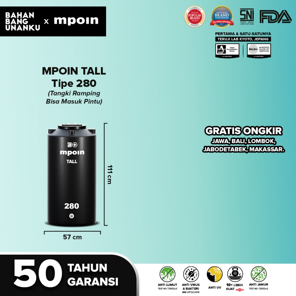MPOIN PLUS 280 L TALL SERIES - SNI TANGKI AIR TANDON TOREN AIR GARANSI 50TH ANTI LUMUT&ANTI UV