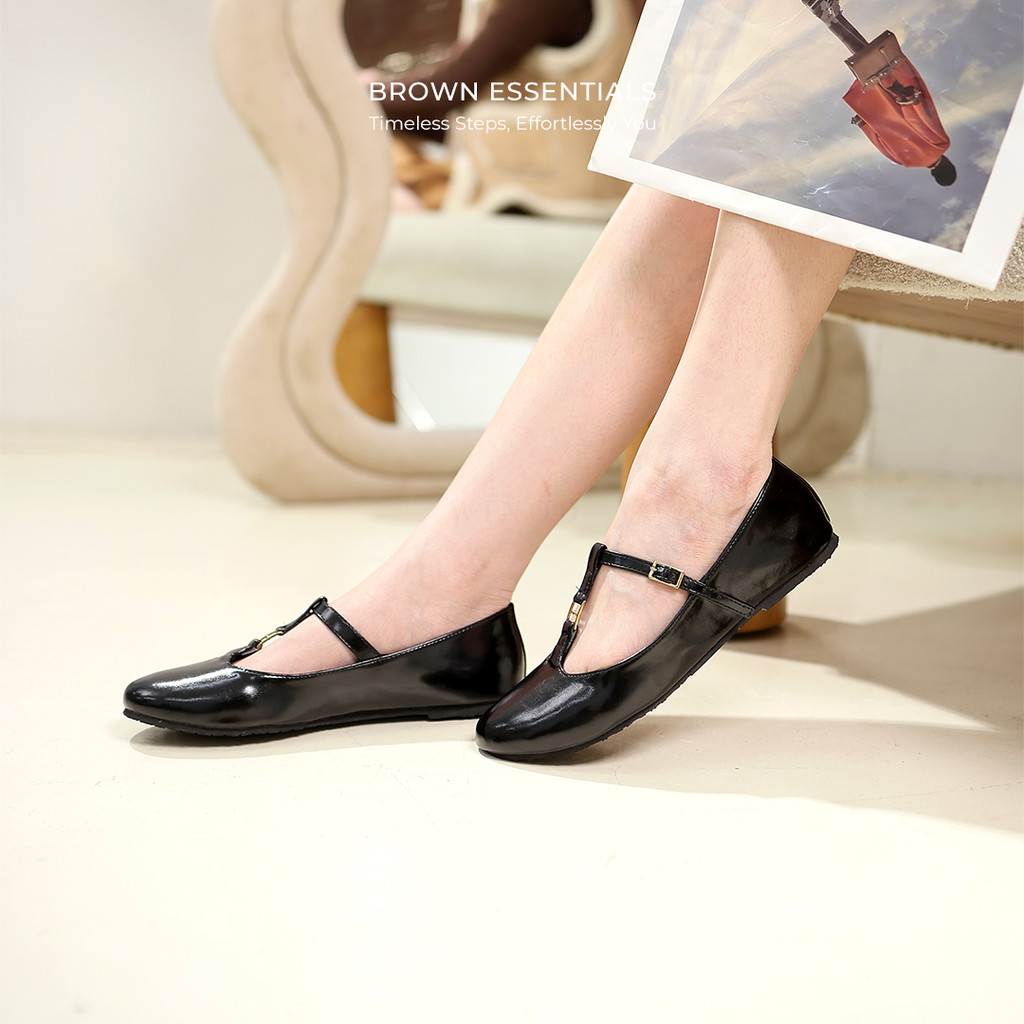 WINOD Nesya Sepatu Ballet Flats Model TBar Flatshoes Wanita Hak 2 cm Brown Essentials Daily
