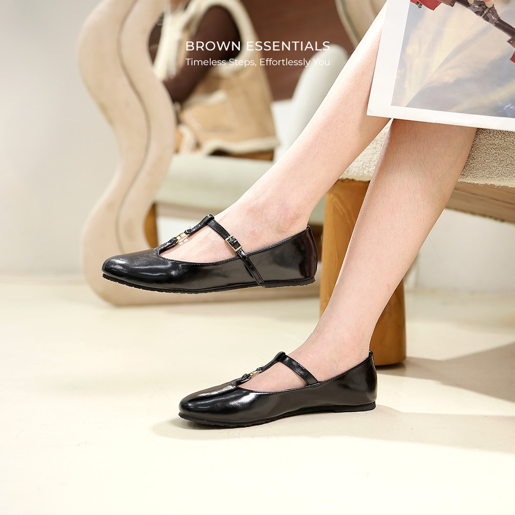 WINOD Nesya Sepatu Ballet Flats Model TBar Flatshoes Wanita Hak 2 cm Brown Essentials Daily