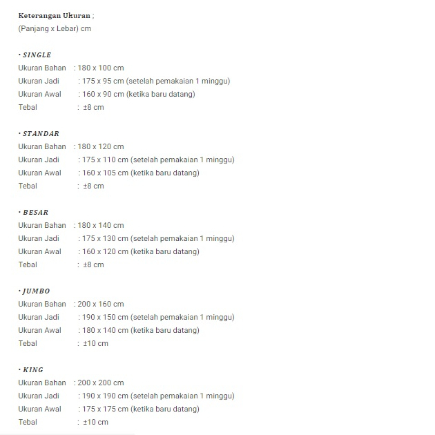 Single (muat 1 org), Standar (muat 2 org), Besar (muat 2+ org), JUMBO (muat 3 org), KING (muat 4 org)