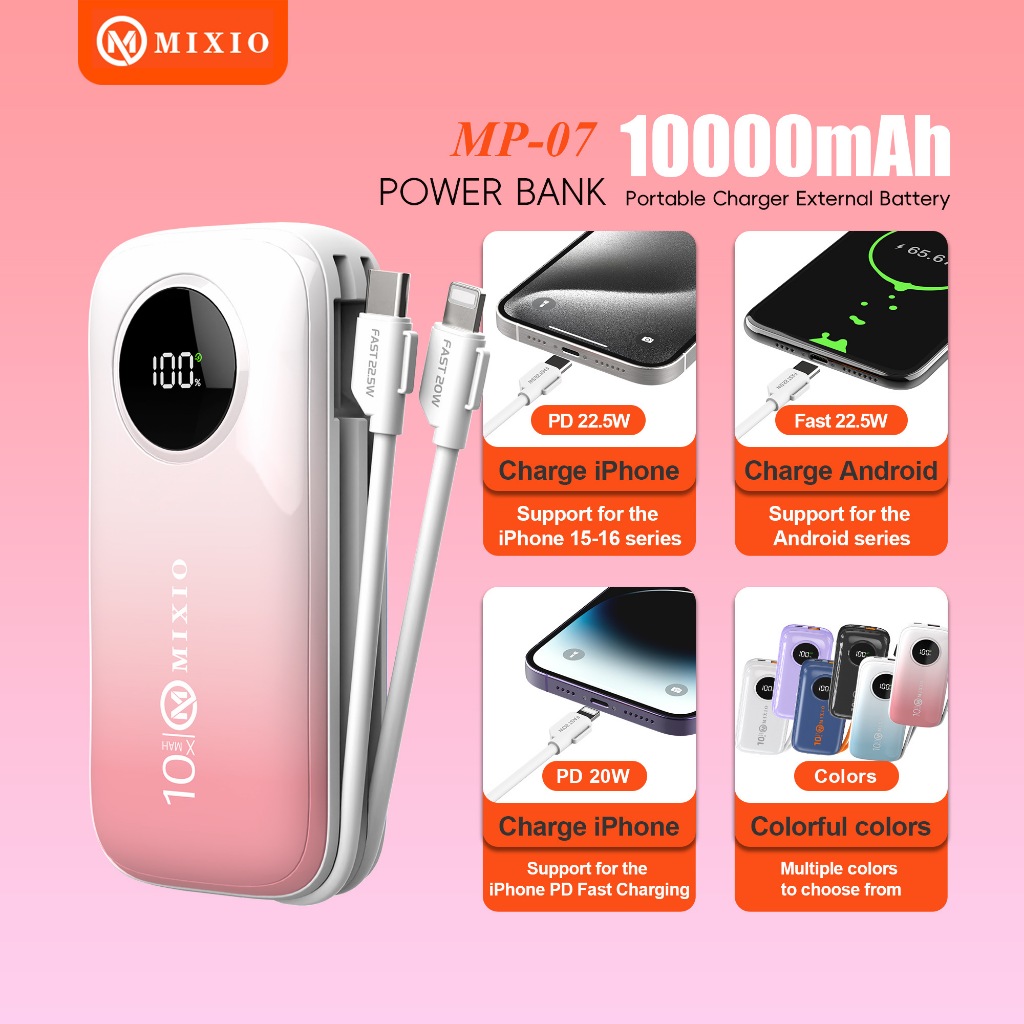 Powerbank Mini MIXIO MP07 10000mAh 22.5W Fast Charging Kabel Type C dan Lightning