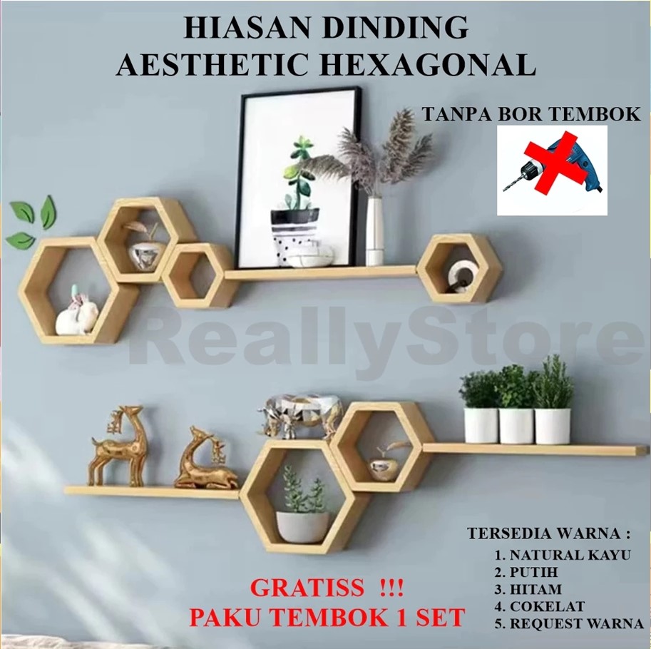 Rak Dinding Tempel Serbaguna Kayu Jati Belanda Minimalis Hiasan Dinding Aesthetic Rak Hexagonal