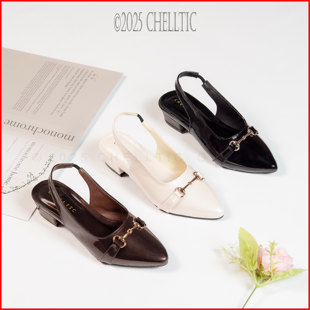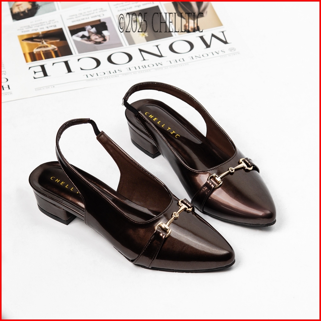 Chelltic Enzy - Sepatu Heels Wanita Hak 3 Cm Elegan Kekinian Terbaru Sandal Mules Slip On Slingback Hitam Mahogany Glosy