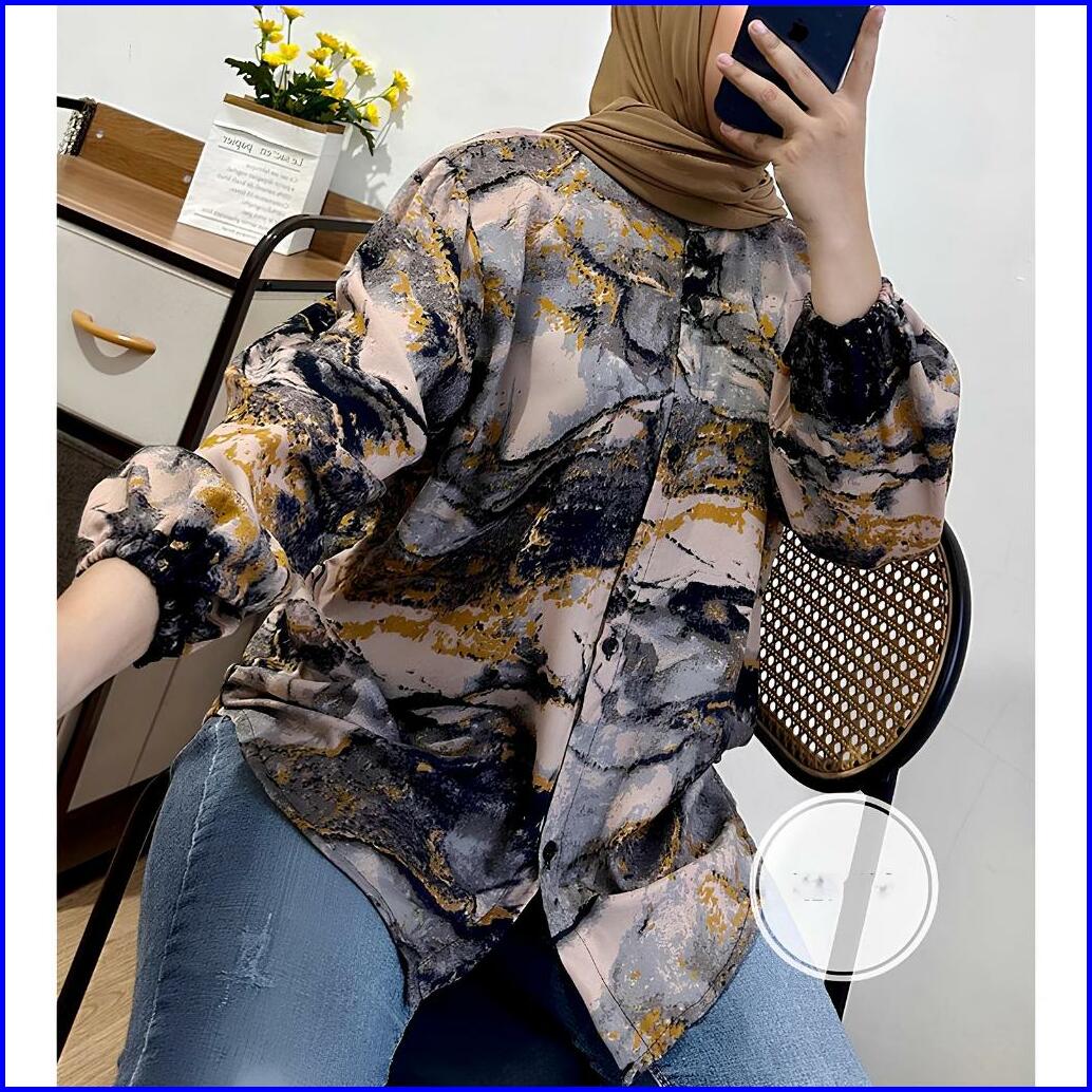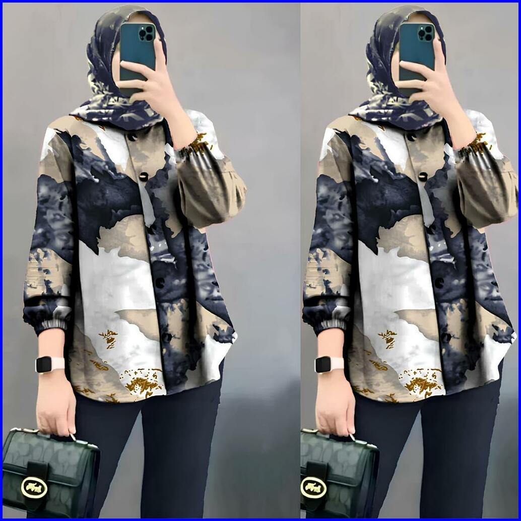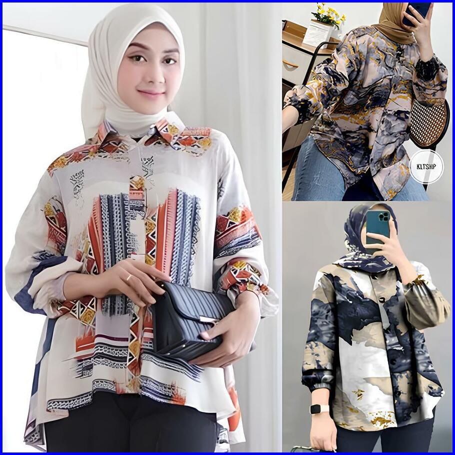 Kemeja Motif Abstrak Wanita Jumbo Lengan Panjang 7 8 Katun Rayon Model Selegram Terbaru