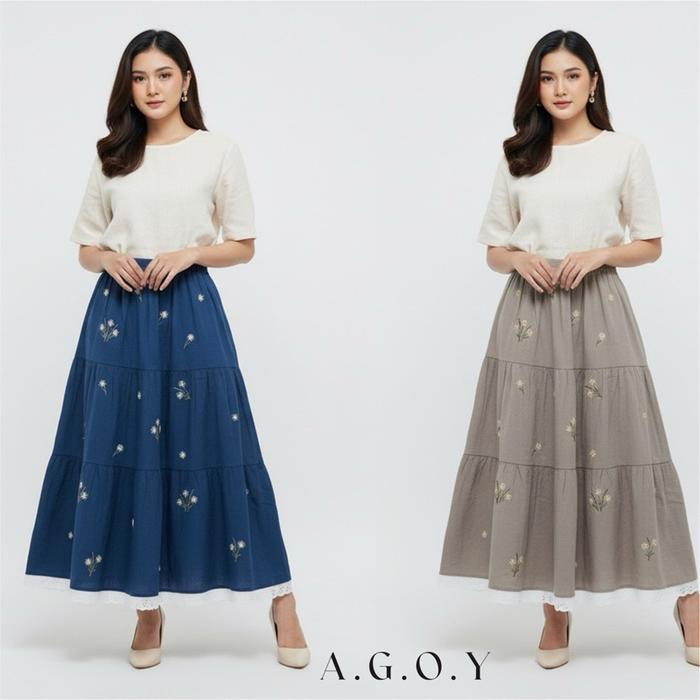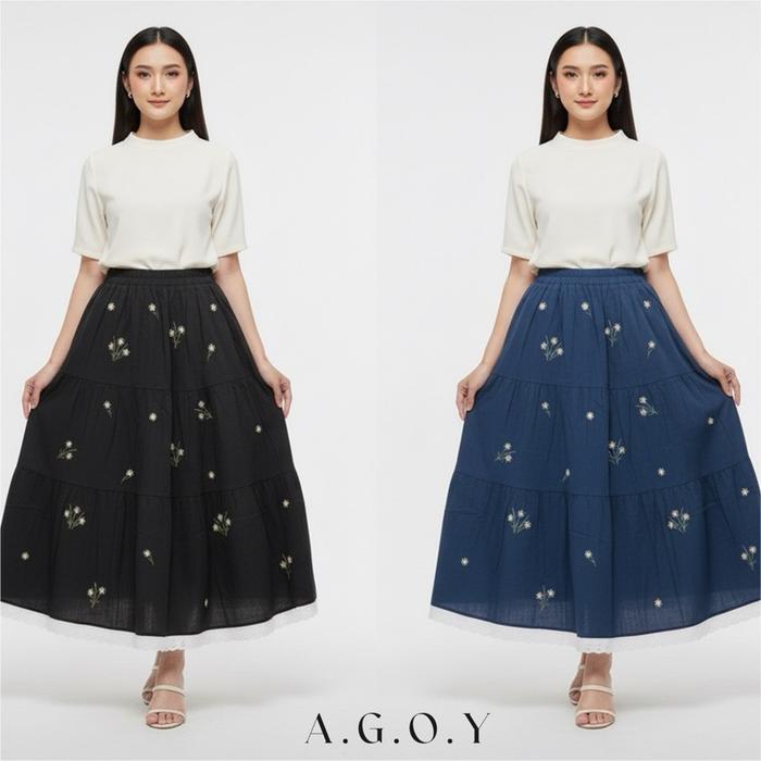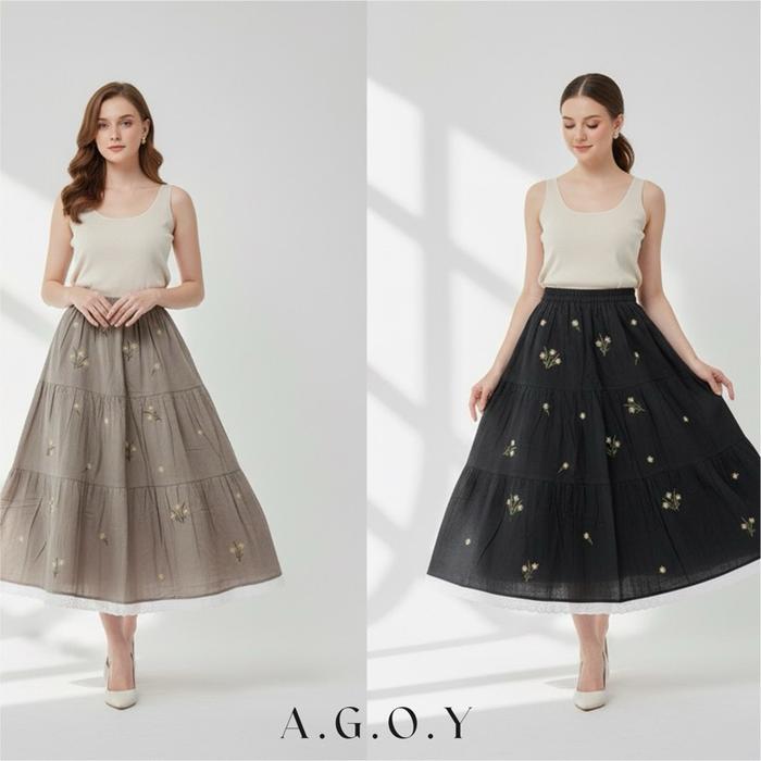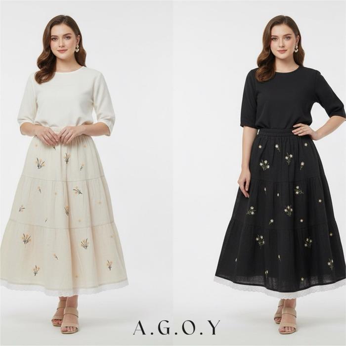 A.G.O.Y - Limited Edition Rok Bordir Linen Premium – Skirt Midi Elegan, Adem & Modis - Black