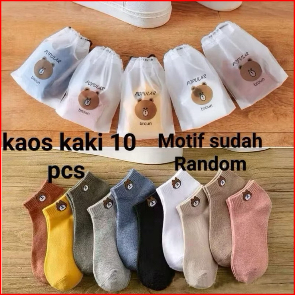 10pcs Kaos Kaki Polos Motif Beruang Pouch Isi 10 Pasang Mix Warna