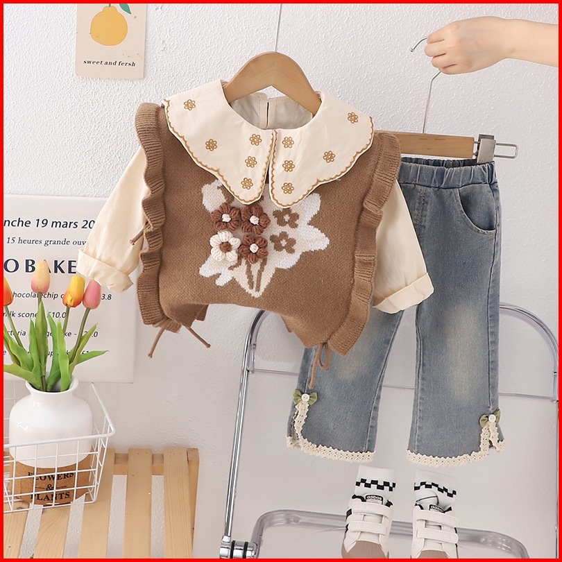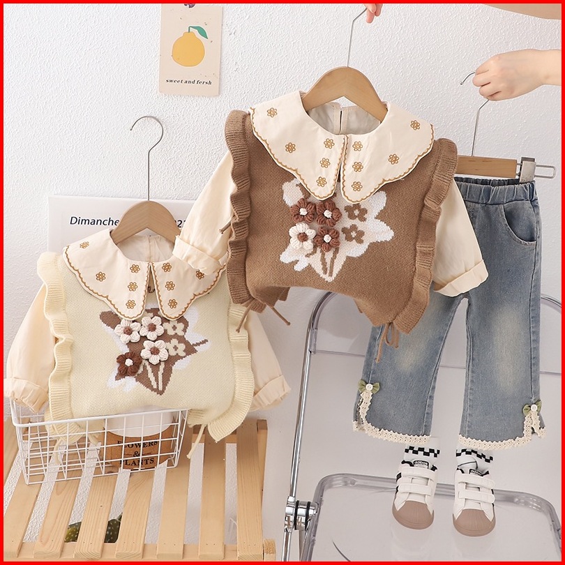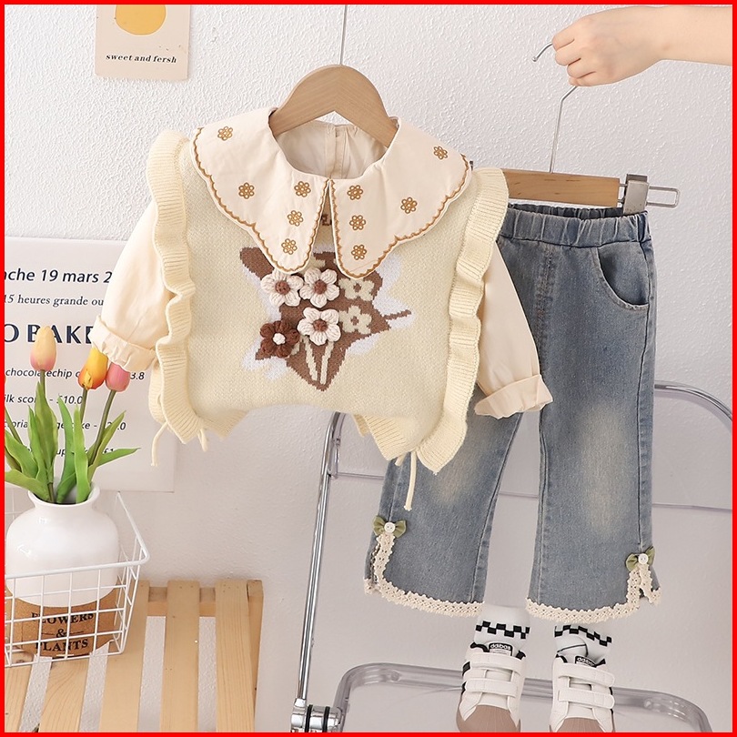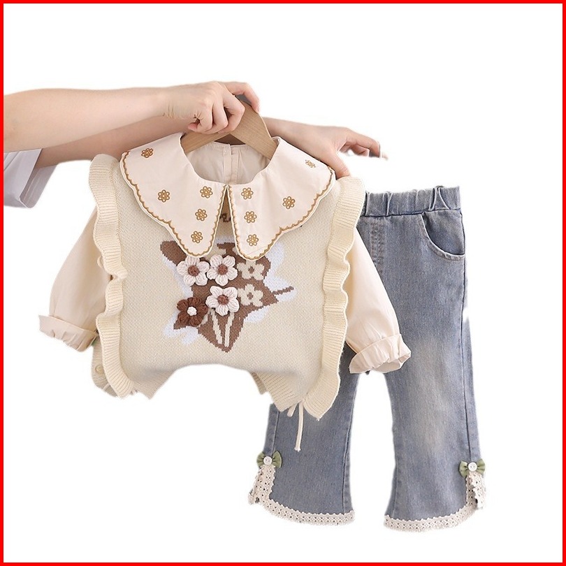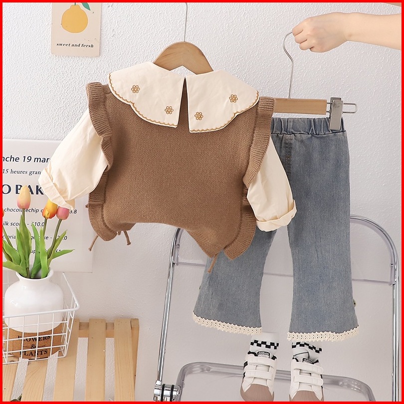 Joyfultots Setelan Anak Perempuan Jeans Kasual Atasan Dua Potong Palsu Lengan Panjang Gaya Korea Set