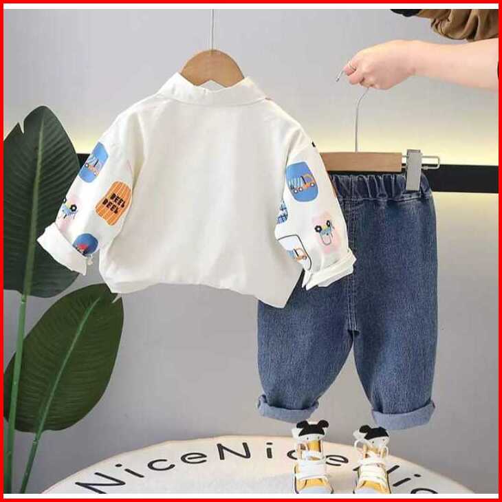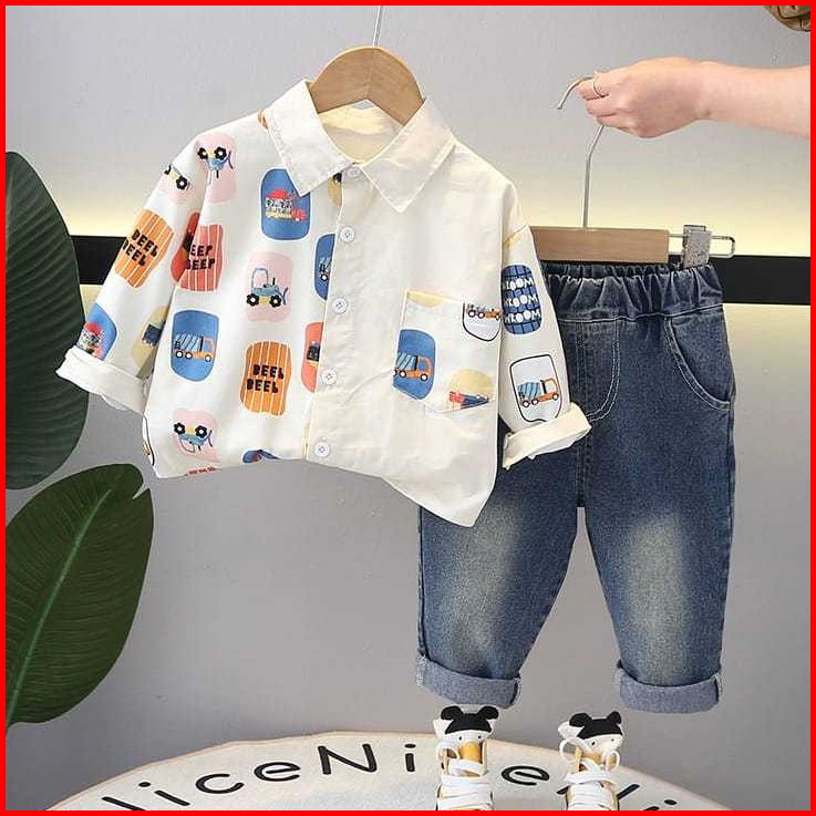 Setelan Anak Laki-laki Kemeja Motif Mobil Jeans Baju Anak 6 Bulan 5 Tahun Mazakids