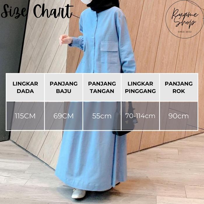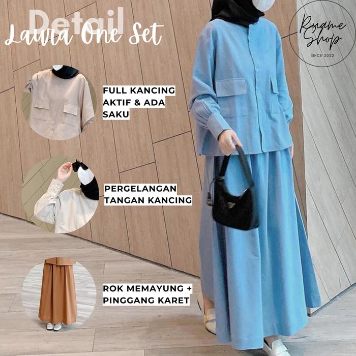 Ruame Shop Laura Setelan Katun Linen Wanita One Set Rok Dan Atasan Blouse Hijab Style Polos Outfit Remaja - Blue