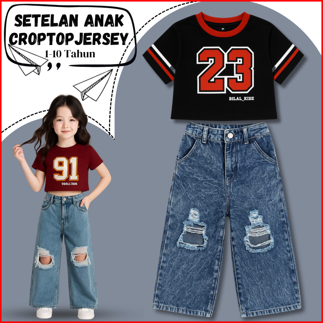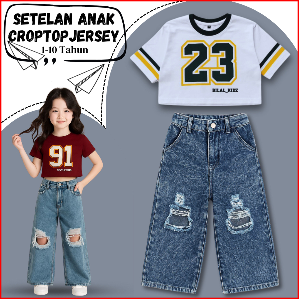 Setelan Anak Kulot Denim Sobek Korea Dan Kaos Jersey Anak Cewe Kekinian 1-10 Tahun