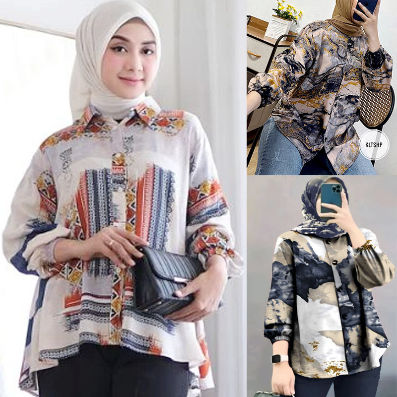 kemeja wanita jumbo motif abstrak lengan panjang 7/8 katun rayon model selegram terbaru
