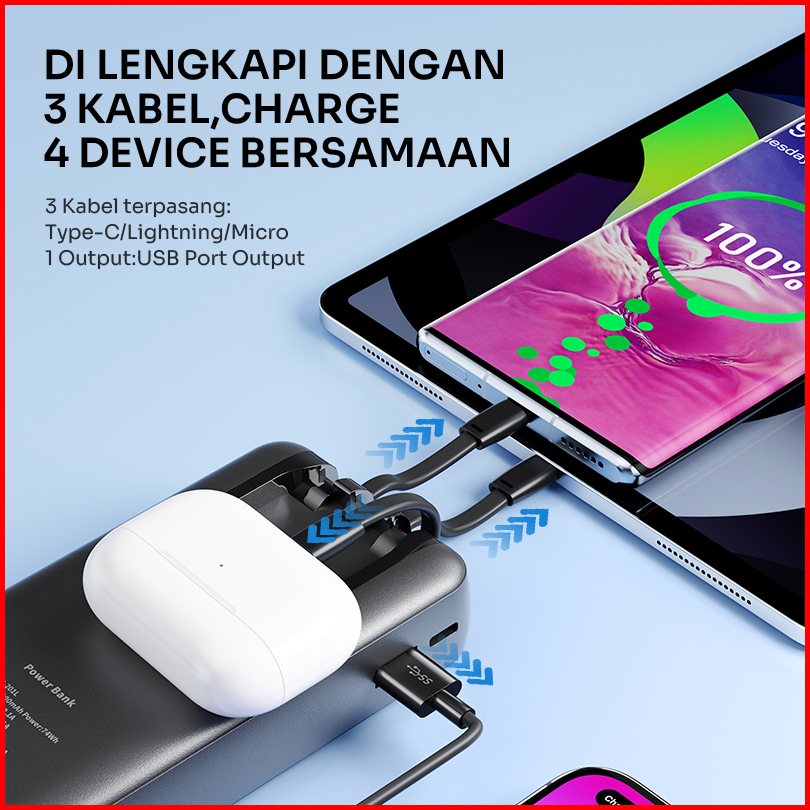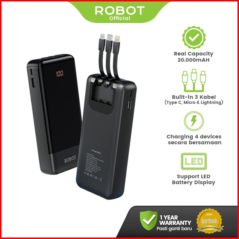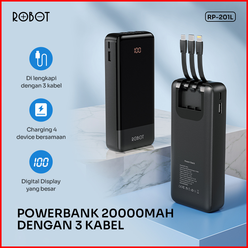 Powerbank Robot 20000mah Rp-201l 2.1a Dengan 3 Kabel Type C Lightning Micro - Garansi 1 Tahun
