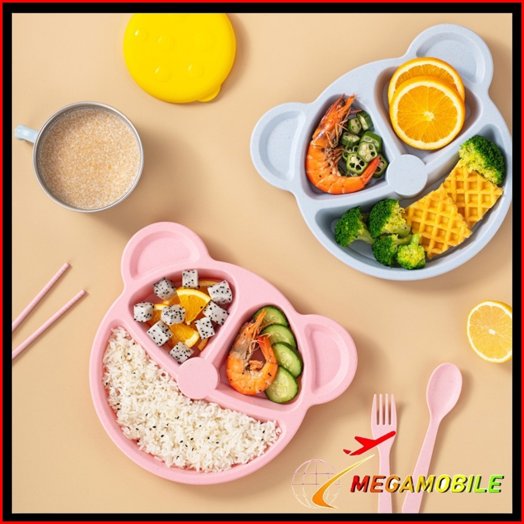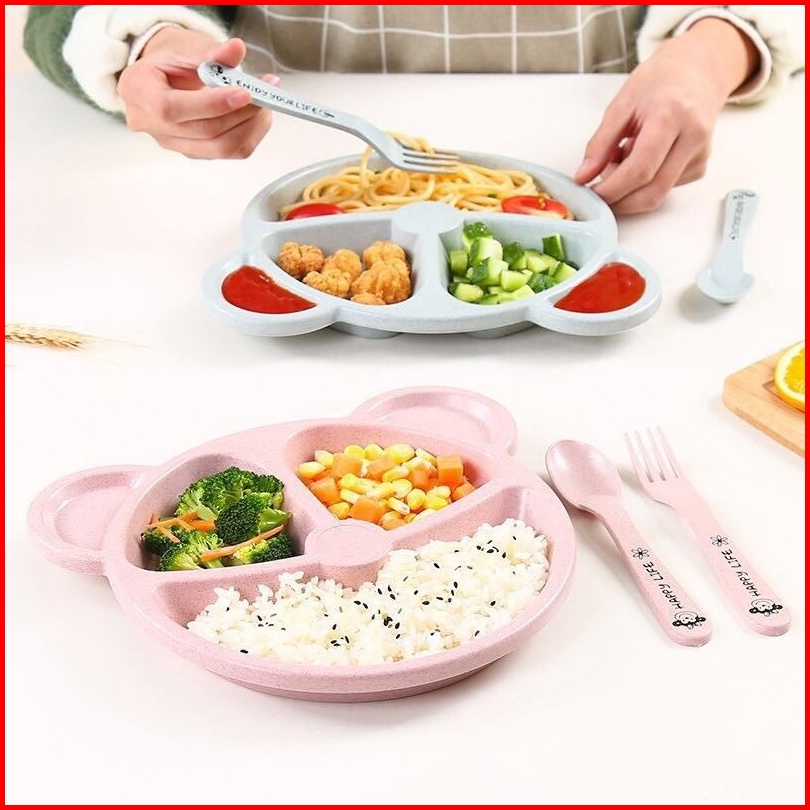 Mm - Peralatan Makan Anak Set 3-piece Bentuk Bear Tempat Makan Bayi Bahan Jerami Baby Feeding Set Cartoon Tableware Piri