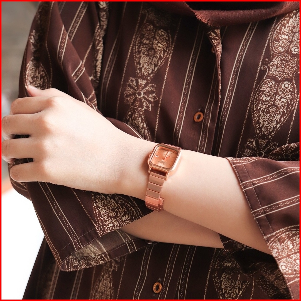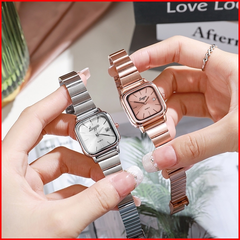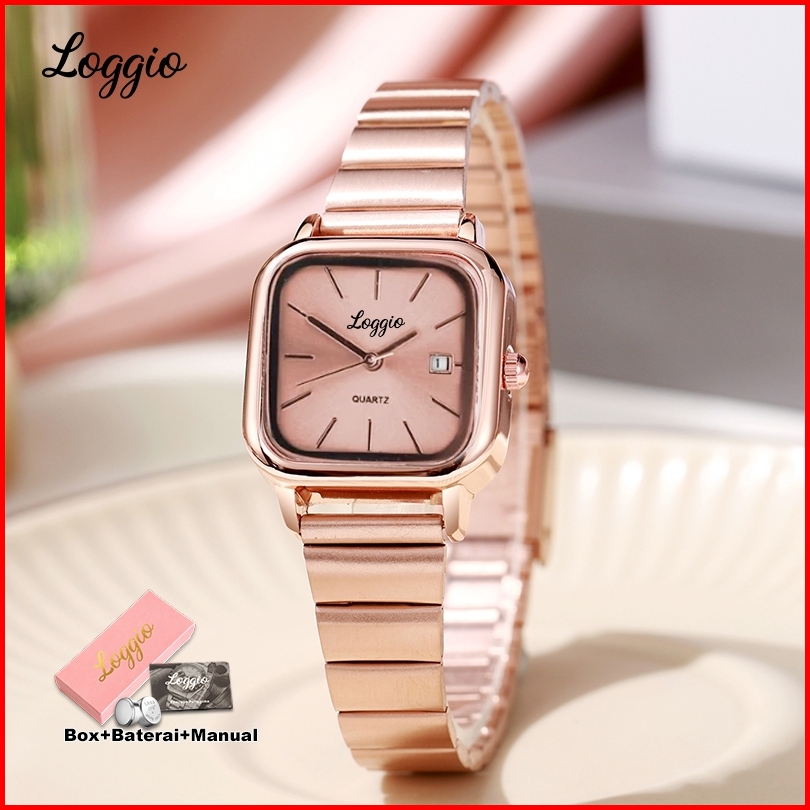 Loggio Jam Tangan Wanita Kecil Analog 100 Tali Rantai Stainless Steel Dial Kotak Simpel Modern
