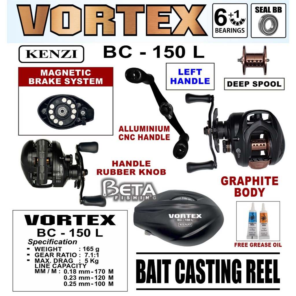 REEL KENZI BC VORTEX 150L Left Handle Bait Casting Reel Graphite Body