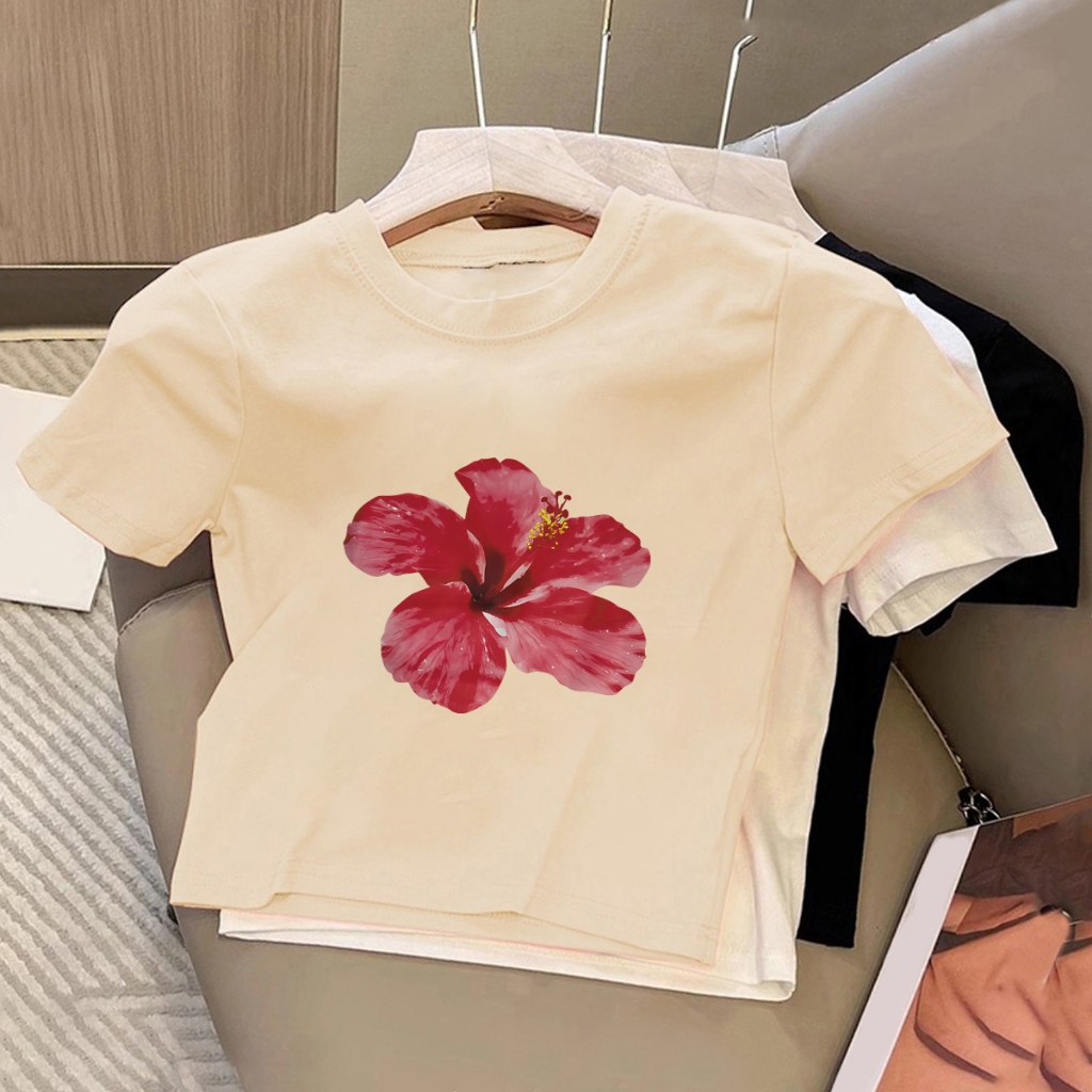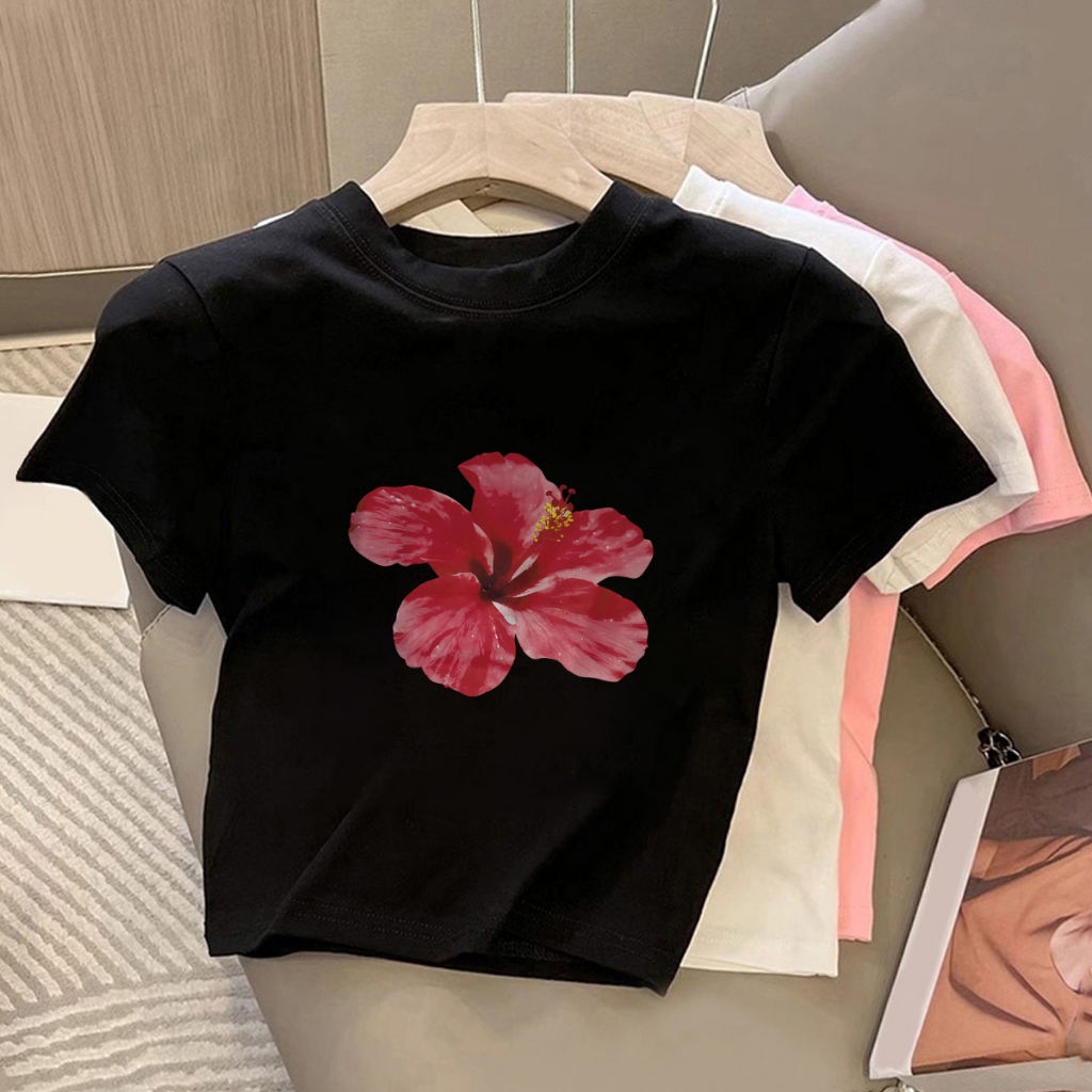 Jw T-Shirt Crop Top Lengan Pendek Kaos Wanita Crop Top Korea Red Flowers Print Kaos Crop Wanita Kekinian Baju Crop Top W