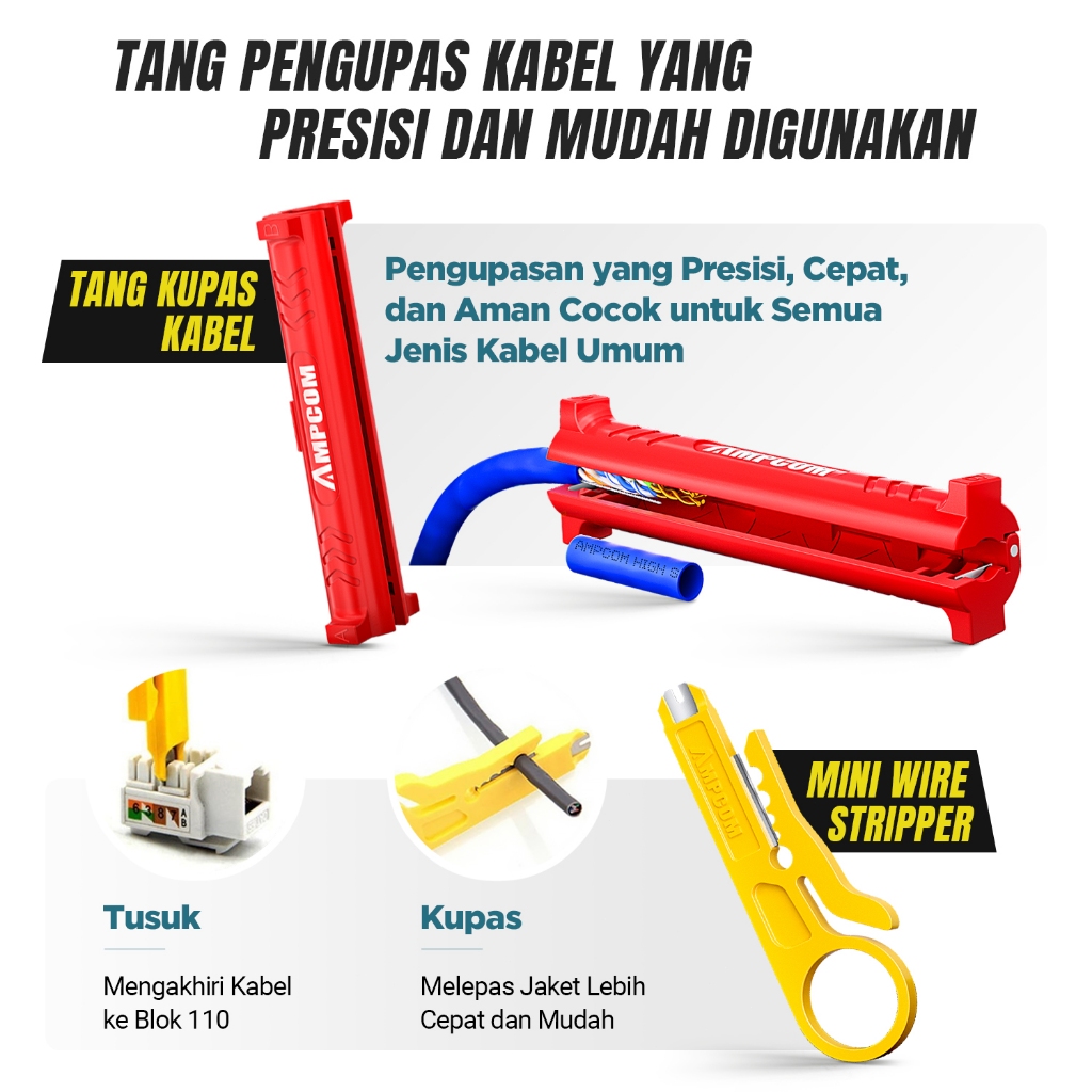 AMPCOM Alat Crimping Ethernet Kit untuk Konektor RJ45 CAT6/CAT5e dengan Alat Pengas Kabel/Alat Punch Down/Tester Kabel T