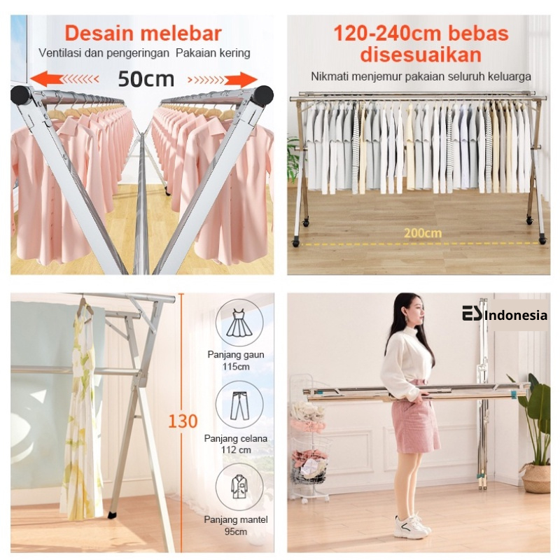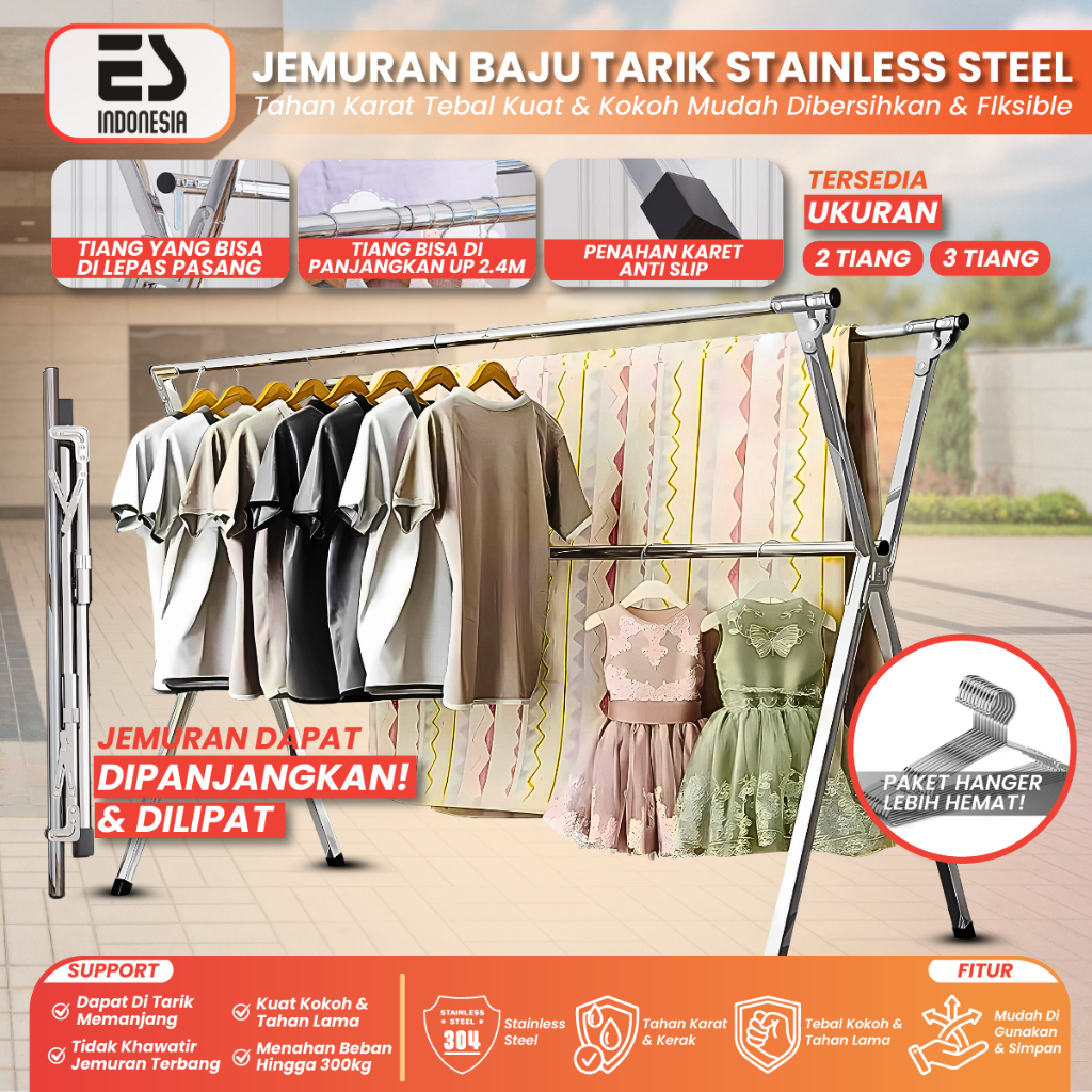 ESINDO Jemuran Pakaian Baju Lipat Portable Stainless Steel Tiang Hanger Tarik Jumbo Kuat Anti Karat