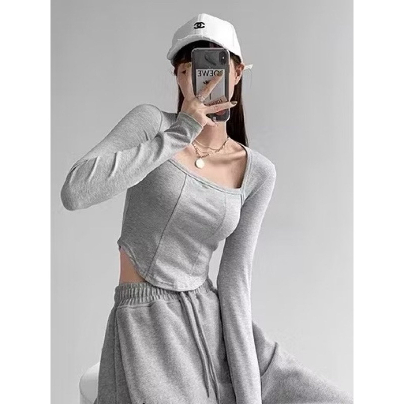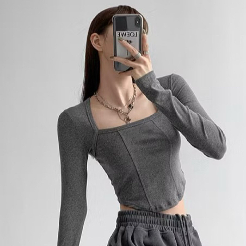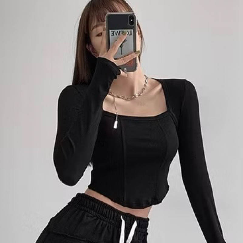 Kaos Crop Lengan Panjang Leher Kotak Crop Top Long Sleeve