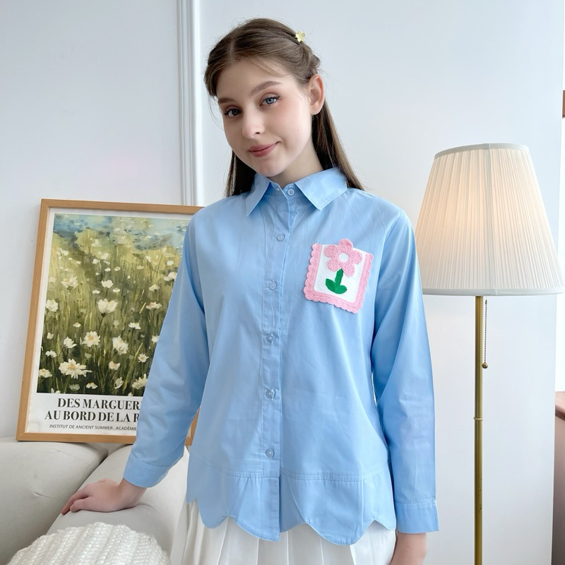 [ Senchi ] - Hana Flower Wave Detail Shirt / Kemeja Kantong Bunga Lucu Wanita / Atasan Kemeja Style Jepang Korea / Atasa