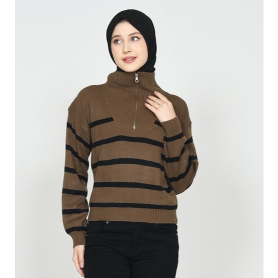 CARDIGAN ZIPPER RAJUT TEBAL LENGAN PANJANG SWEATER RAJUT TOP KNITWEAR ATASAN WANITA STRIP SLETING KEKINIAN TERMURAH
