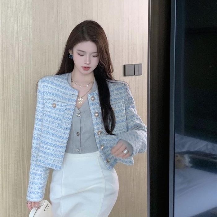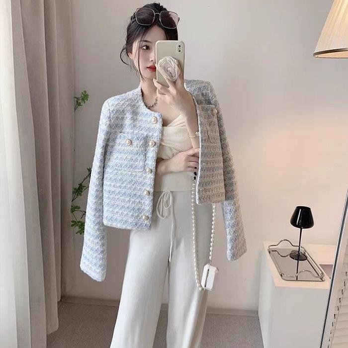 Blazer / Outer Retro Biru Tweed Style Korea Atasan Wanita Casual Cardigan Crop Winter Import Premium M601 - Biru, M