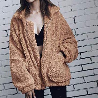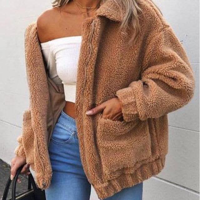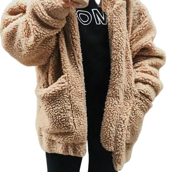 Sweater Wanita Jaket Bulu Sherpa Coat Saku Zipper Winter Tebal Fit Parka Outer Oversize - Moka, S/M