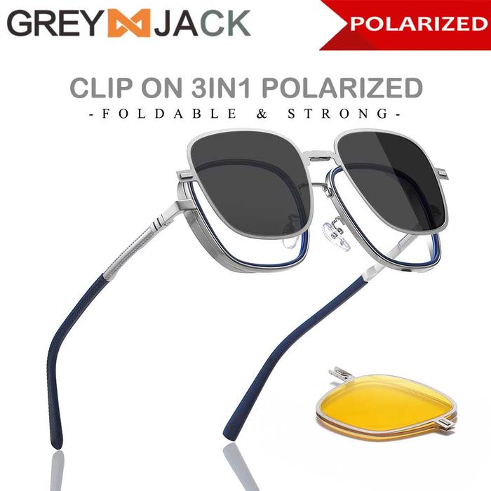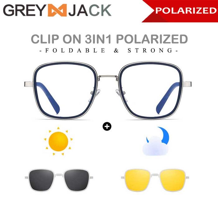 Kacamata Pria Wanita Grey Jack Kacamata Frame Clip On 3in1 Free Lens Polarized Night Drive Model