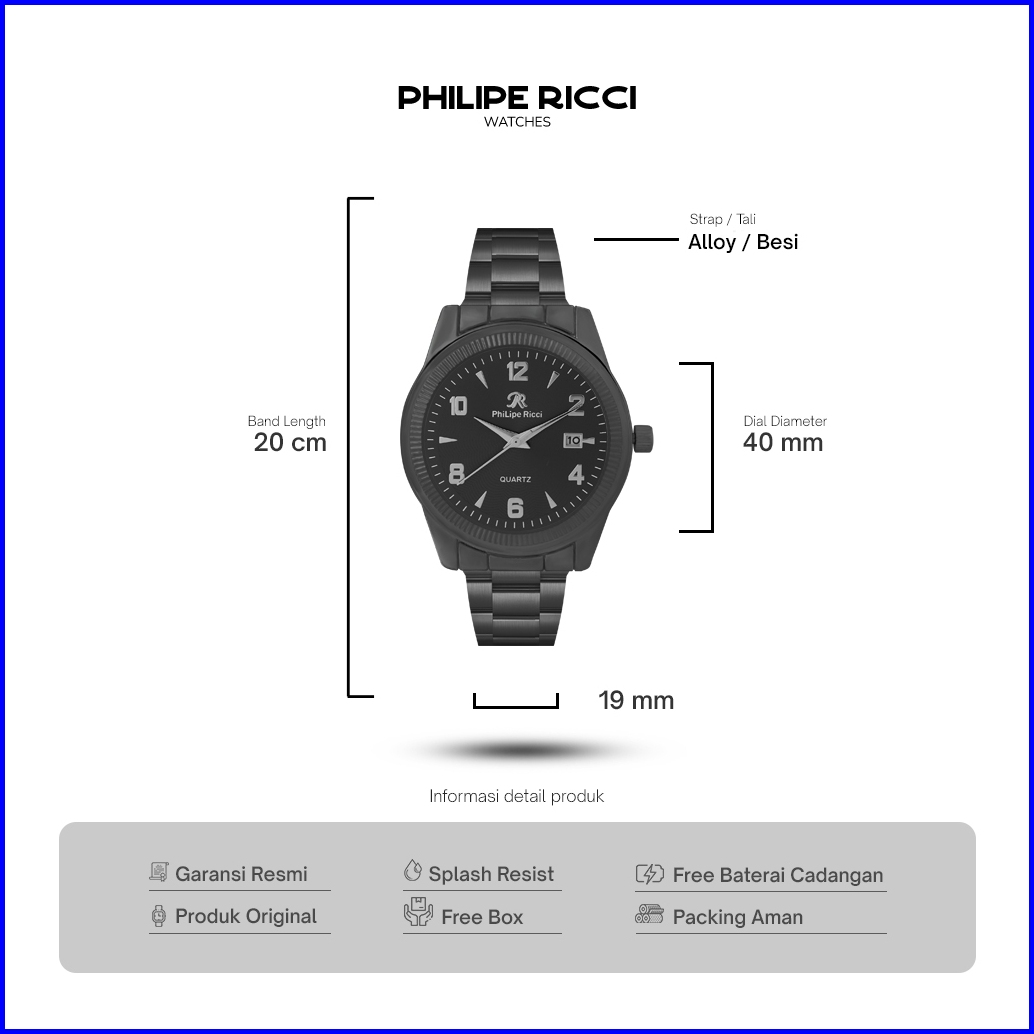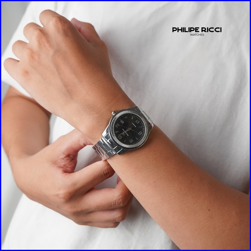 Philipe Ricci Jam Tangan Pria Rantai Besi Terbaru Original Simple Hitam Keren 8060d Free Baterai