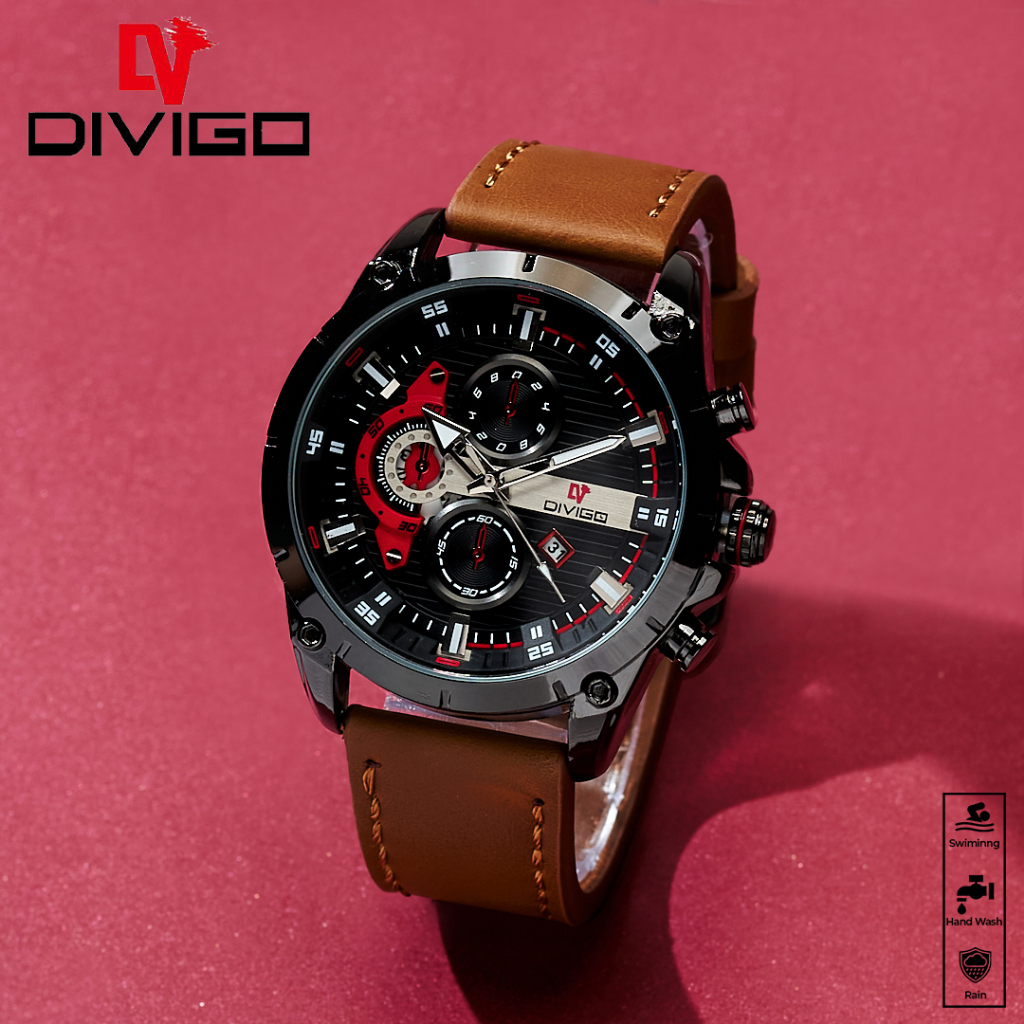 Jam tangan Pria Divigo Original DV-7017-1 Strap Kulit Tanggal Aktif Tahan Air