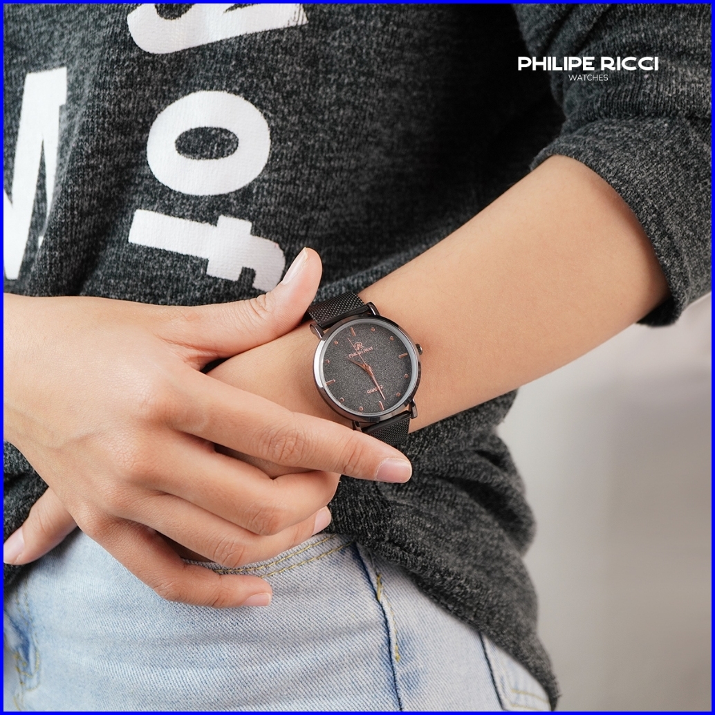 Philipe Ricci Jam Tangan Wanita Rantai Pasir Bulat Tipis Desain Kekinian 7488 Jam Cewek Rose Hitam