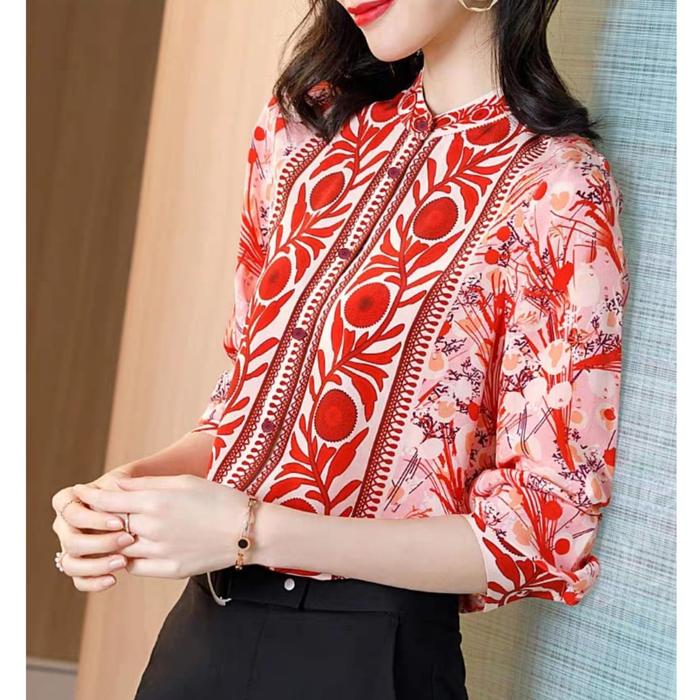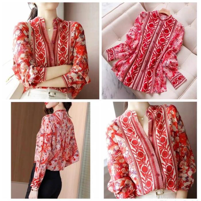 [Basica Moda] 0749 Atasan Top Blouse Wanita Redplum Kancing Motif - Red