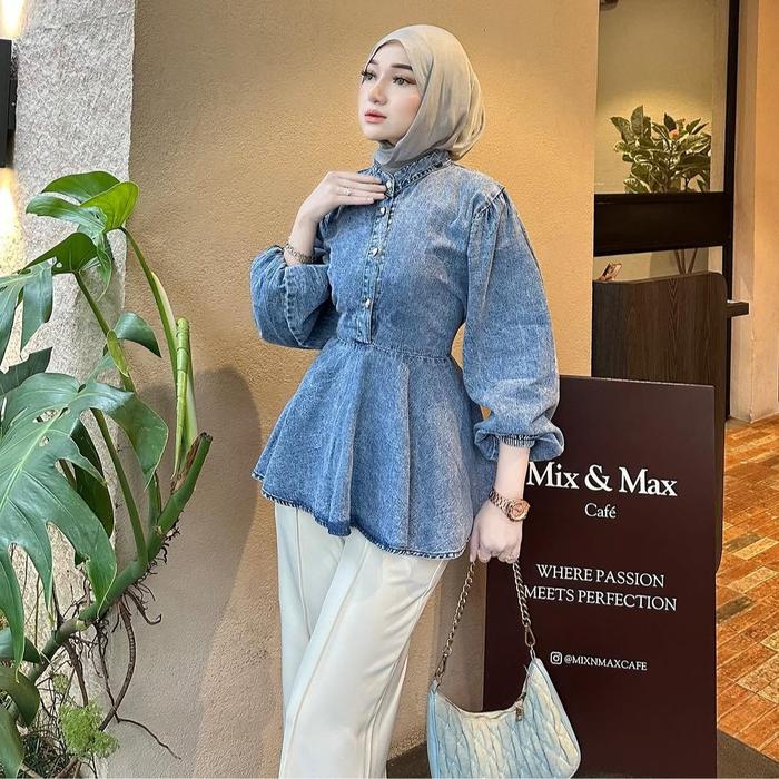 Pola Wear | Aeera Blouse Denim Wanita Atasan Kemeja Jeans Nyaman Formal Lengan Panjang Peplum Oversize Baju Santai - Aee