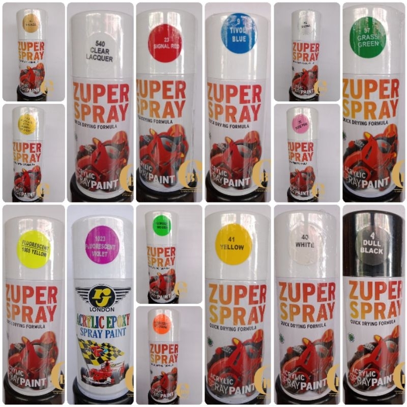 Leaf Green(27), Grass Green(37), Yellow(41), Blue(21), Indigo Blue(502), Tivoli Blue(9), Clear(540), White(40), Black(39), Rose Pink(30), Signal Red(23), Maroon(38), Exclusive Maroon-210, CTM Honda Blue(1103), CTM Honda Yellow1102, Met Silver(1580), CTM Yamaha Red(1108), Met Black(1139), Bronze(35), Silver(36), Violet blur(1143), Hitam gloss (39), Clear doff(10), Ninja green(173), White STD (400), Executive grey(459), Orange(14), Silver red(6), Shogun green(176), Curacao blue(216), Hino green(29), Neon blue(511), Met.Laguna green(189, Dull/doff black 4, Putih doff (20), Priper white(91), Cerulean blue(19), Stabilo orange(1006), Stabilo yellow(1005), Stabilo biru(1004), Stabilo hijau(1003), Stabilo pink(1002), Stabilo red(1001), Amplas kasar(10pcs), Amplas sedang(10pcs), Amplas halus (10pcs), Medium grey (26)