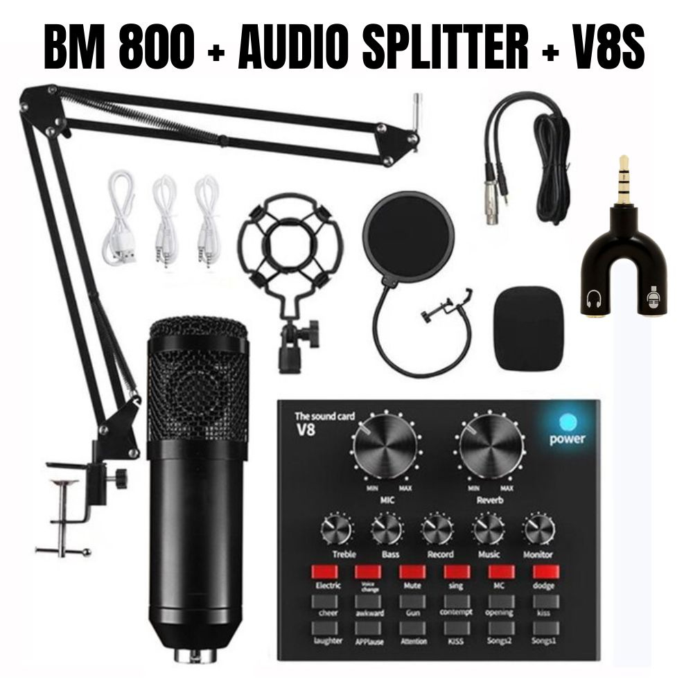 Alat Studio Paket Lengkap Mic Condenser Podcast Full Set Microphone Condenser Bm 800 + Stand + Pop Filter + Soundcard V8