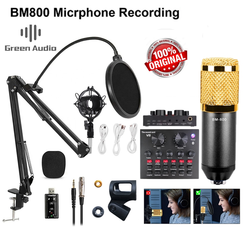Paket Kumplit Mic Condenser Bm 800 + Stand + Soundcard V8 + Splitter - Full Black/48V Phantom Power