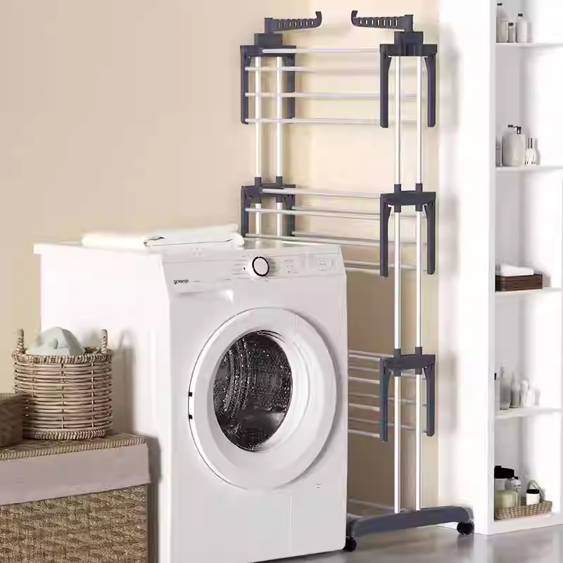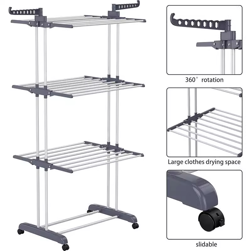 Rak pengering pakaian lipat multifungsi, rak handuk dan sepatu, 24 baris + 14 slot + 4 lapis, dengan roda