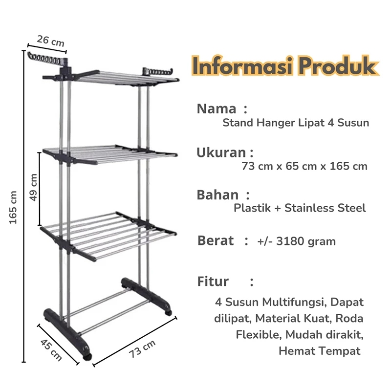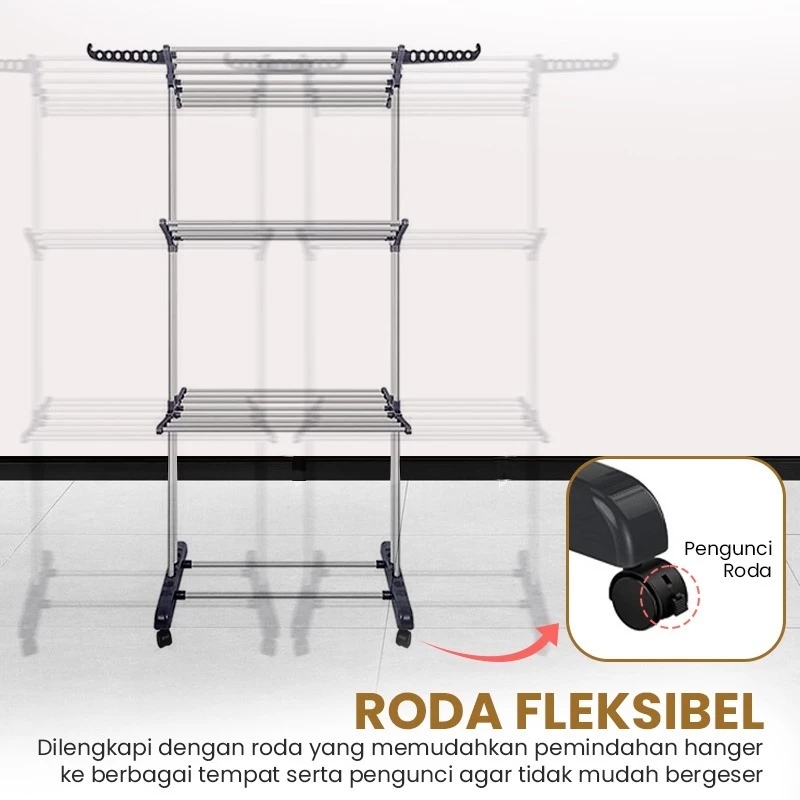Rak Jemuran Lipat Baju Handuk Sepatu 24Baris+14 Slot 4Susun Dgn Roda Gantungan Pakaian B03A