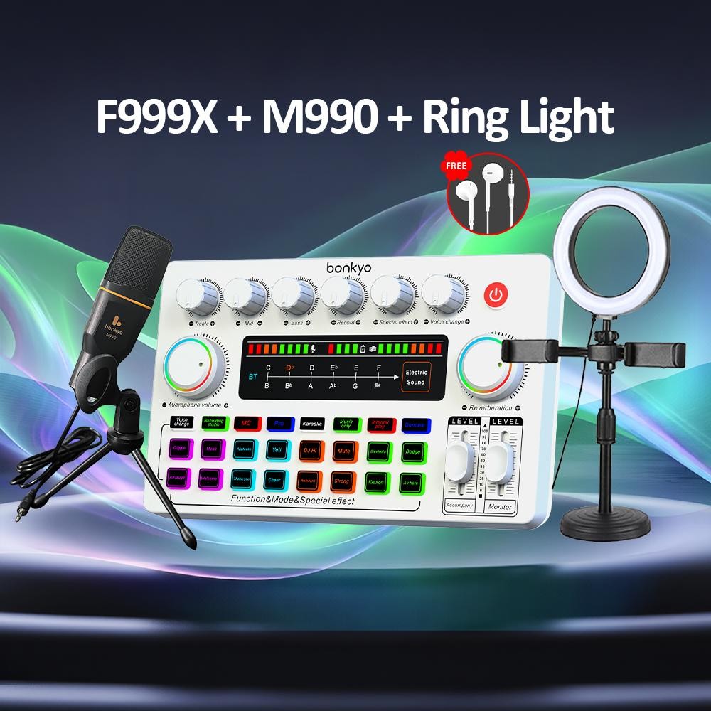 Bonkyo Paket Streaming Lengkap F999X: Sound Card + Mikrofon M990 + Lampu Pengisi | Cocok Untuk Penyanyi Tiktok, Streamin