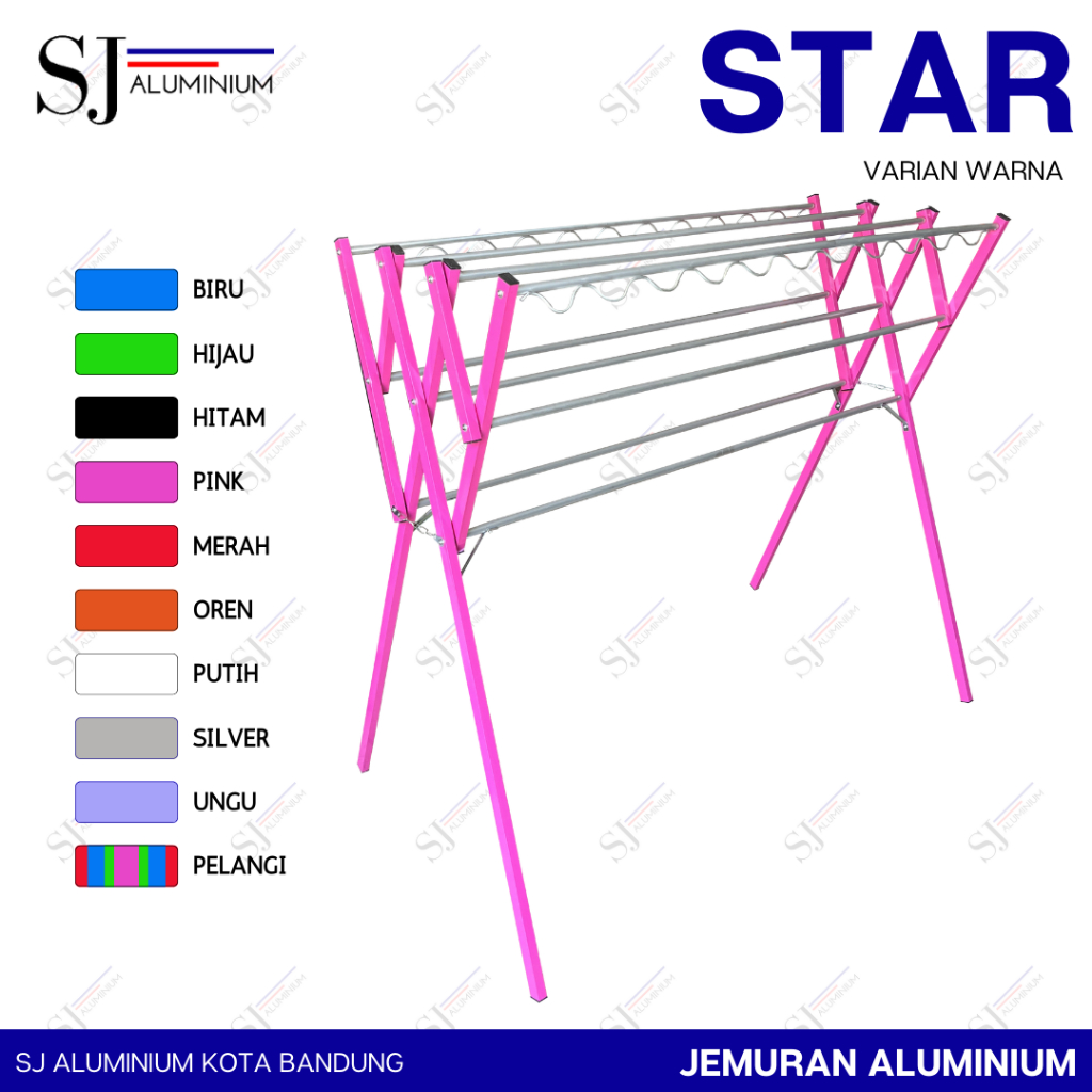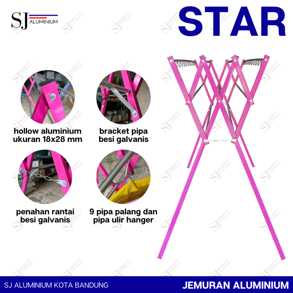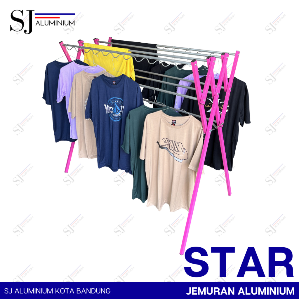 STAR - Jemuran Baju / Pakaian Aluminium - Rak Handuk Lipat 135 CM Warna Pink - Tahan Beban 20 KG Ukuran 1,35 Meter