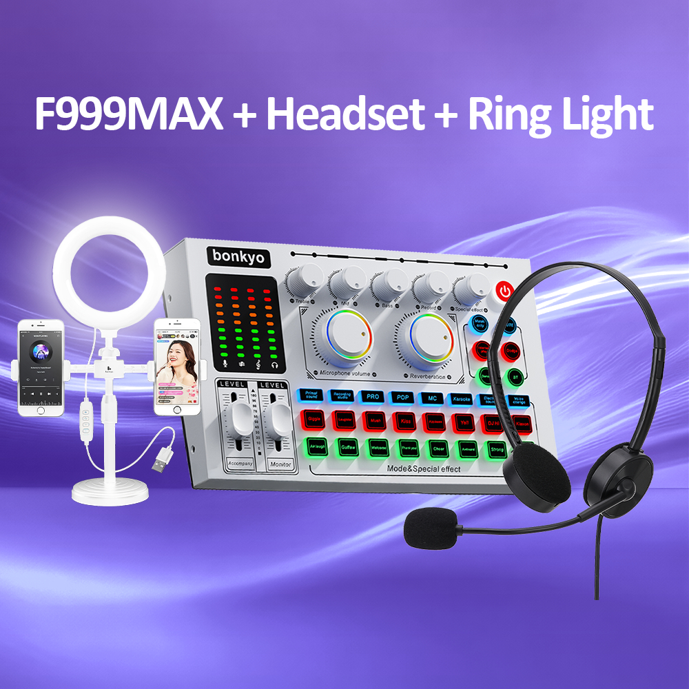Hi-Net&Bonkyo 【Set Streaming Lengkap】Sound Card F999Max + Headset Lipat Sy442 + Lampu Penguat Cahaya - Ideal Untuk Live