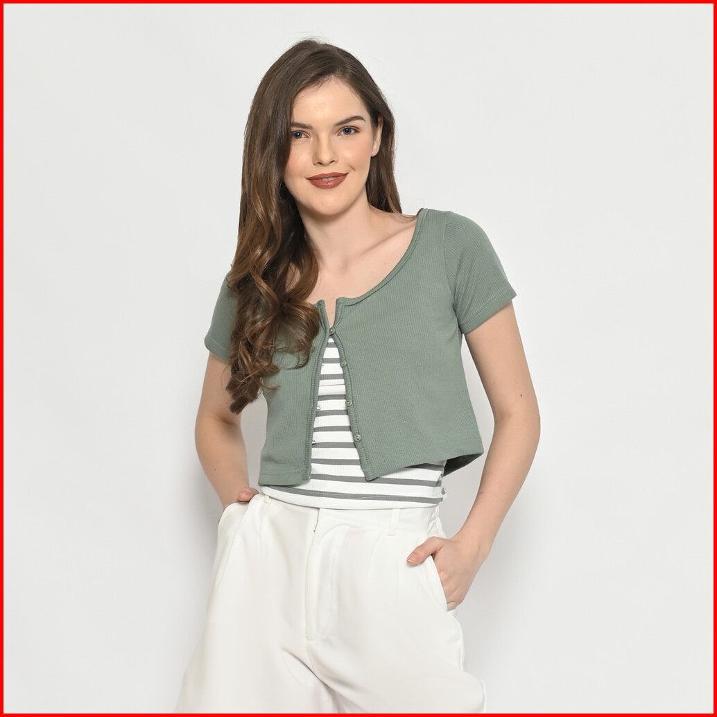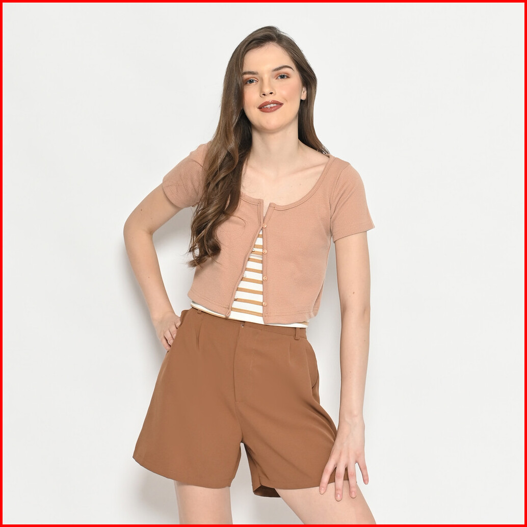 Queentin Tanktop Cardigan Wanita Crop Set 0681 Stretch Caramel Knit Polos Salur Lengan Pendek