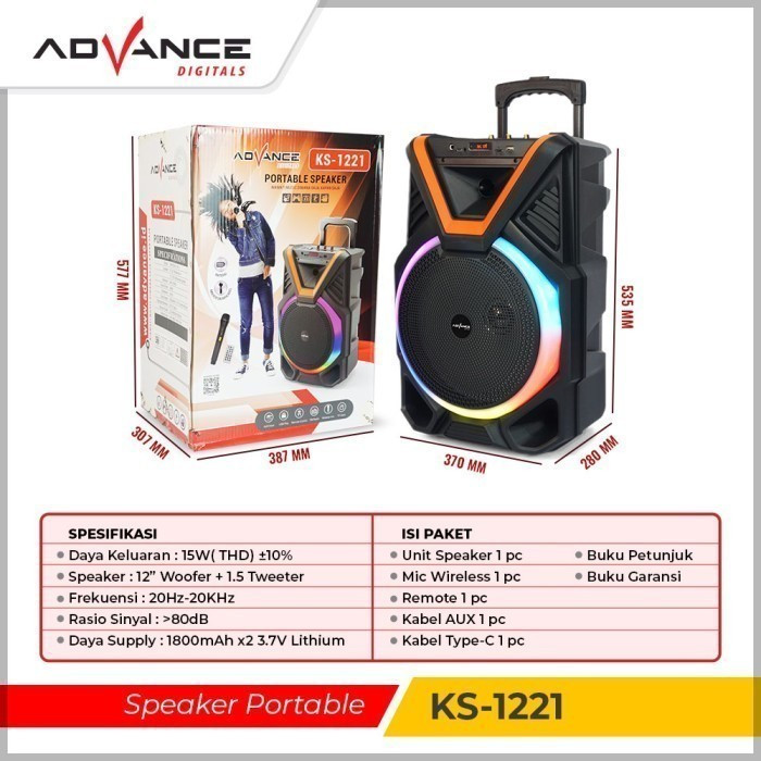 Speaker Advance Ks-1221 Wireless Bluetooth Portable 12 Inch Free Mic