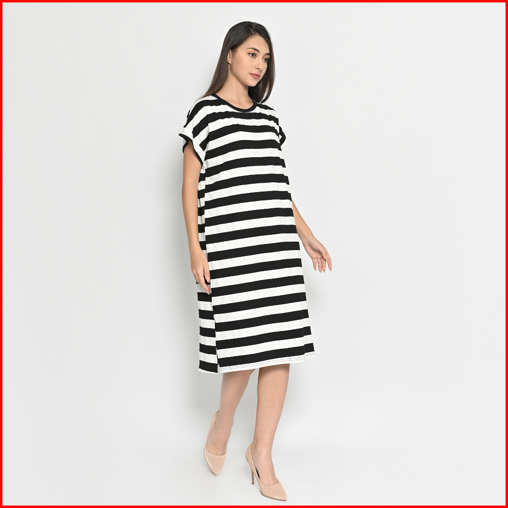 Queentin Korean Dress Wanita 6058 Rajut Striped Stretch Premium Lengan Pendek